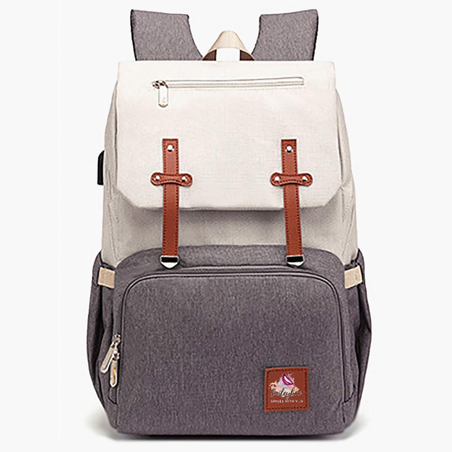 SMILEYBOO Sac à Langer Sac à Dos - Sac à Langer Imperméable Unisexe - Multi Poches Sac à Couches avec Port USB et Rétention de la Chaleur pour Biberon avec Câble USB - Crème et Marron