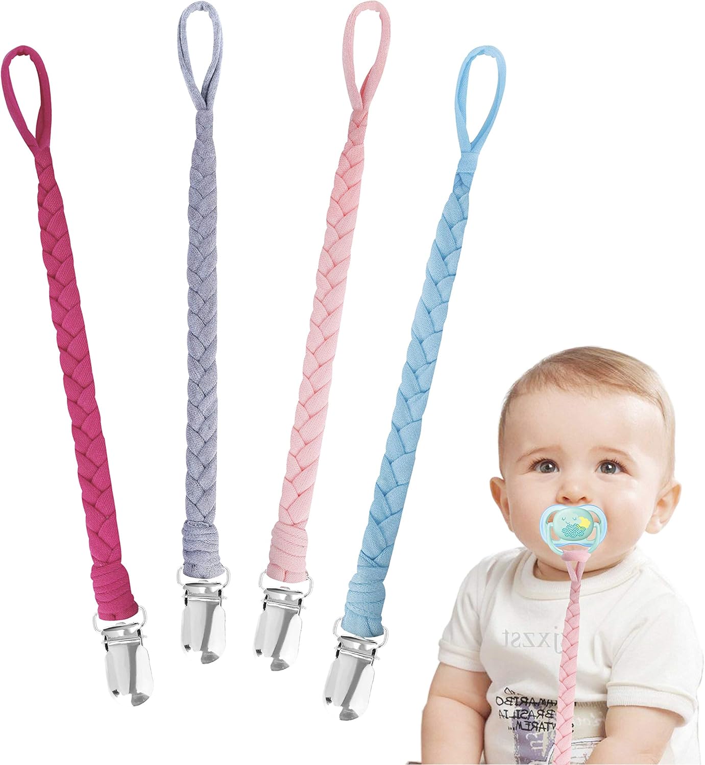 Attache-tétine, paquet de 4, chaîne pour sucettes tressée flexible pour tout-petits, couleur pure
