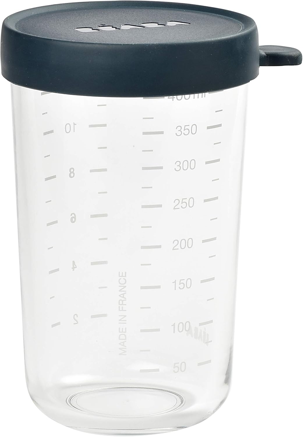 BÉABA, Portion Conservation Repas Bébé/Verre Extra Résistant, 100% Hermétique, Résiste à la chaleur et Choc thermique, Congélation, Stérilisation, Graduation, Made in France, 400 ml, Dark Bleu