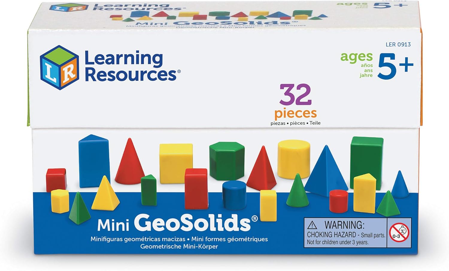 Mini kit GeoSolids sur les rapports de Learning Resources. Enseignez les formes, les tailles et les rapports grâce à des éléments géométriques colorés en plastique. Comprend huit formes de quatre tailles différentes : 4 prismes triangulaire, 4 cubes, 4 cônes, 4 cylindres, 4 prismes rectangulaire, 4 prismes hexagonal, 4 pyramides triangulaire et 4 pyramides à base carrée. Chaque forme mesure entre 1,27 cm et 4,4 cm. Guide de l'enseignant inclus. À partir de 5 ans. Il y a 4 cônes, 4 cubes, 4 prismes hexagonaux, 4 pyramides carrées, 4 cylindres, 4 pyramides triangulaires et 4 prismes restangulaires