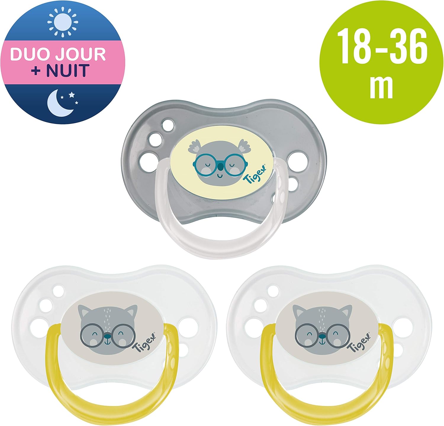 Tigex sucettes réversibles jour et nuit, de 18 à 36 mois, silicone, sans BPA, lot de 3, blanc et gris [Garçons, Filles]
